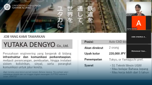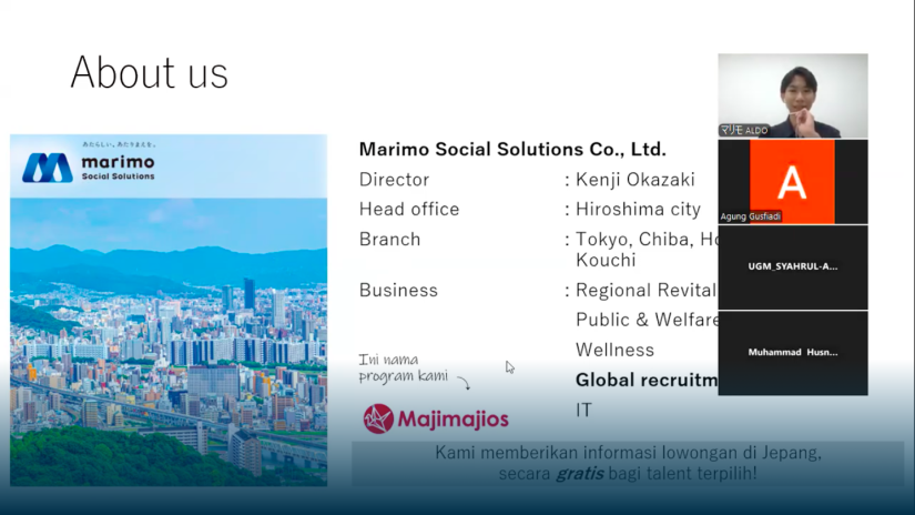 Marimo Social Solutions menyelenggarakan webinar tentang peluang kerja di Jepang melalui Zoom, Kamis (11/9). Webinar ini bertujuan mengajak mahasiswa dan alumni Teknik Mesin UGM untuk berkarier di Jepang, khususnya sebagai Auto CAD Engineer di perusahaan Yutaka Dengyo Co., Ltd. dan Sanken Sangyo Co., Ltd.
