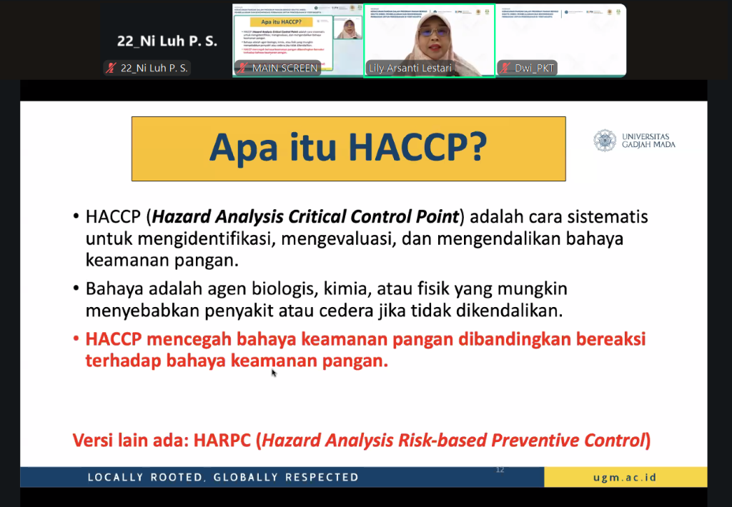 Selanjutnya, Yeni Prawiningdyah, SKM, M.Kes menjelaskan implementasi HACCP dalam skala besar layanan kesehatan, khususnya di Rumah Sakit Umum Pusat (RSUP) Dr. Sardjito. Ia mengatakan bahwa rumah sakit harus menyediakan makanan aman untuk kelompok rentan dan menerapkan regulasi Undang-Undang Nomor 18 Tahun 2012 mengenai pangan. Lebih lanjut, Yeni mengaku RSUP Dr. Sardjito rutin melakukan pemeriksaan mikrobiologi terhadap air, peralatan makan, dan kontaminasi silang.