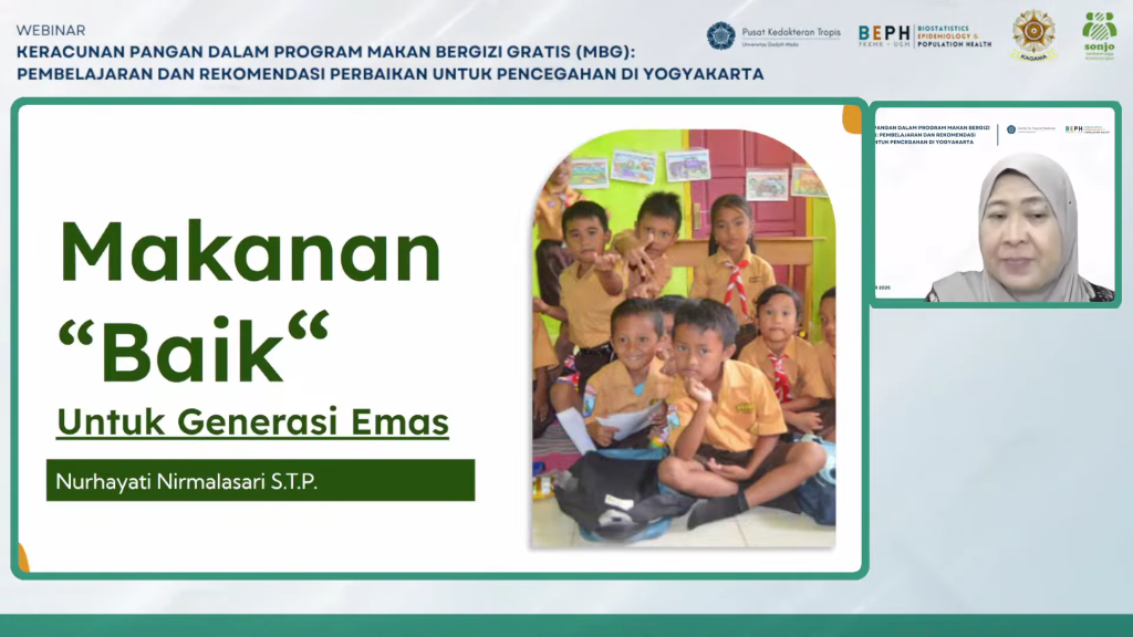 KAGAMA bersama PKT UGM, BEPH UGM, Pusat Kedokteran Tropis UGM, dan Sonjo menyelenggarakan webinar bertajuk “Keracunan Pangan dalam Program MBG: Pembelajaran & Upaya Perbaikan untuk Pencegahan di Yogyakarta” pada Sabtu (04/10). Webinar ini diadakan melalui Zoom Meeting dengan total peserta mencapai 861 orang dan dihadiri oleh berbagai ahli serta dokter dalam bidangnya masing-masing. Webinar ini diadakan sebagai tanggapan dari banyaknya kasus keracunan atau Kejadian luar Biasa (KLB) dalam program Makan Bergizi Gratis (MBG) yang tengah berjalan di berbagai daerah, serta menjadi wadah untuk berbagi hasil kajian dan rekomendasi pencegahan ke depan.